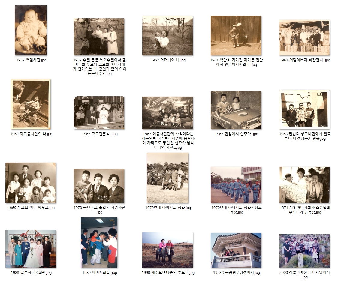 장지문 위에 걸렸던 사진들이 이제는 어머니 옷장의 앨범속에서 나를 기다린다. 그 속의 나는, 여전히 어린아이처럼 웃고 있고, 아버지는 변함없이 묵직한 품으로 나를 감싸고 있다. 사진의 배경은 이미 시간이 멈춘 곳이지만, 내 마음속에서는 삶의 이야기들이 찬찬히 스며나와 여전히 숨 쉬며 살아간다.