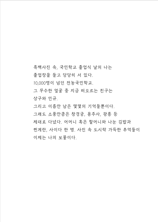 칠순을 앞둔 지금,이 사진들로 마련된 전시 공간은 내 삶의 추억과 감사를 나누는 자리이며,그 기억 속에서 잠시 머물며 나와 가족의 작은 이야기를 되짚는 시간이 되었습니다. 오늘 이곳에 서서, 그 조용한 울림이 누군가의 마음에도 작은 빛으로 번지길 바랍니다.