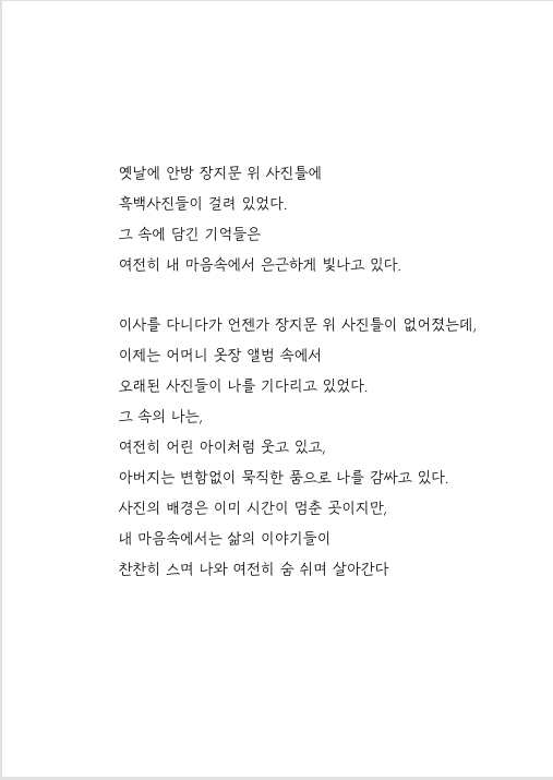 지난 세 달간 동인천의 ‘시와 예술’ 공간에서 “오래된 미래를 만드는 작고 위대한 개인의 역사”를 아우르는 강의를 들으며 옛 흑백사진들속에서 지나간 시간의 무게와 기억의 조각들이 담긴 것을 마주하였습니다.