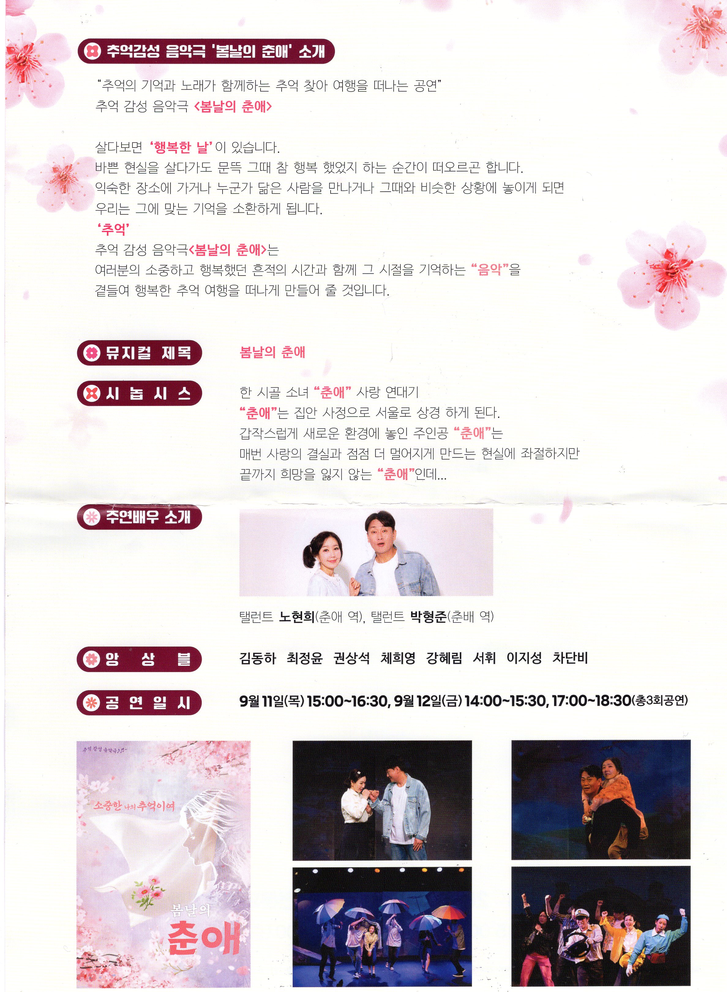아내가 학교 동문회에서 표를 확보했다며 구경 가자던 '봄날의 춘애'. 듣기에도 생소한 음악극에다 솔직히 '노인의 날 축하공연'이라는 말에 큰 관심은 없었다. 하지만 이미 '오래된 마을의 골목 풍경'과 '길위의 인문학 - 장지문위의 흑백사진들' 의 작품전에 참여한 나의 전시회 두 군데를 보러 나온데다 그동안 영화나 연극등을 관람한지 꽤 오래 되었고 저녁 약속 시간까지 여유가 있어 공연장인 인천예술문화회관을 찾았는데, 신파조의 음악극이 옛 추억의 감성을 이토록 세차게 건드릴 줄은 몰랐다.
