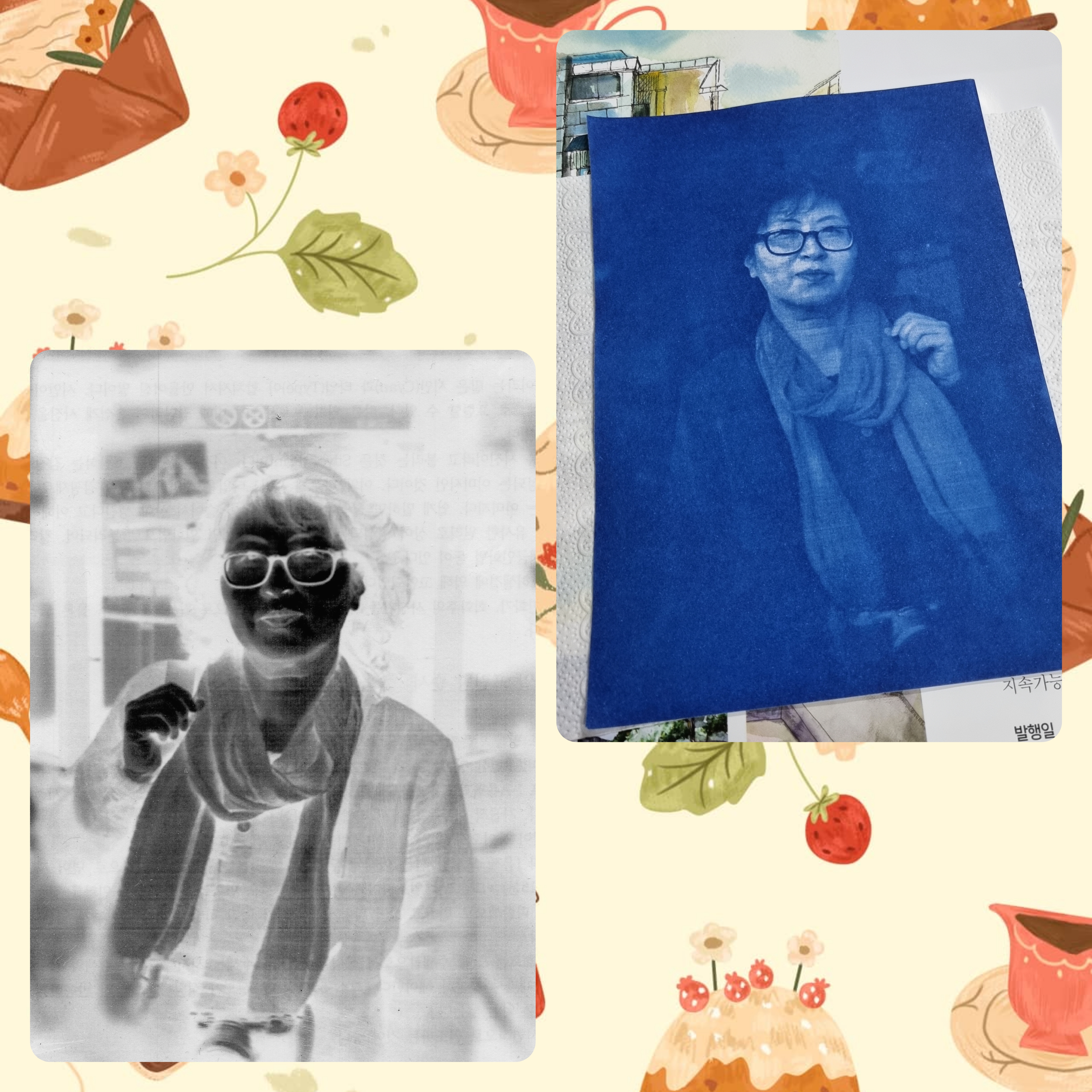 그리고 마침내 푸른빛 아내의 모습이 나타났다! 오랜 시간을 건너온 듯한 푸른색의 사진은 나를 짜릿하게 했다. 단순히 사진을 인화하는 것을 넘어, 햇빛과 시간이 만들어낸 아날로그적 흔적이 오롯이 담겨 있다는 사실이 흥미롭게 느껴졌다. 이 작품은 나에게 단순한 사진 한 장이 아니라, 아내와의 추억이 담긴 시간이 더해질수록 더욱 깊은 의미를 지닐 '100년 사진'이 될 것이다.