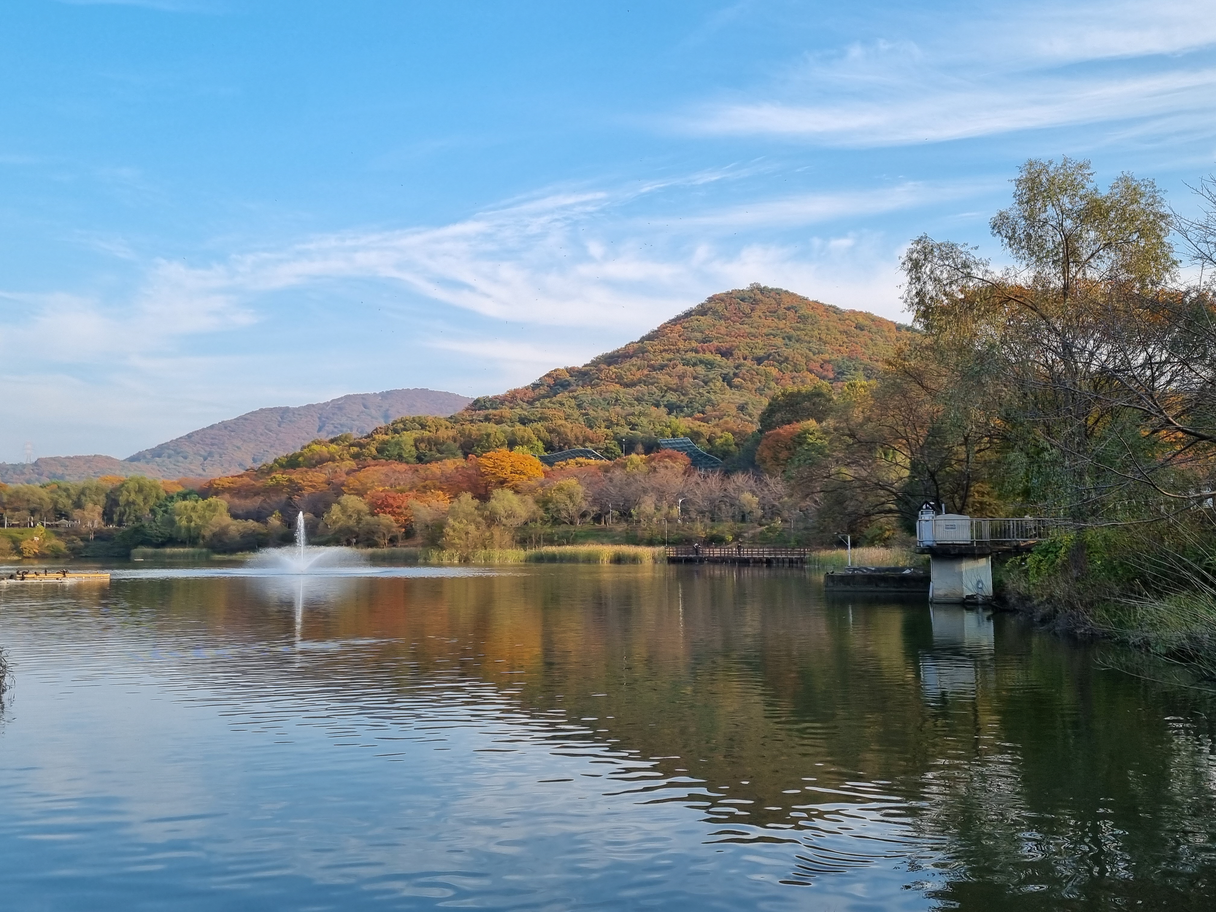 호숫가로 향한다. 물 위를 유영하는 잉어 떼의 노련한 몸짓과, 느긋하게 물가를 오가는 오리들의 한가로움이 평화로운 정경을 만든다. 멀리 소래산이 묵묵히 대공원 전체를 내려다보는 모습은, 이 모든 풍경을 초연하게 감싸 안는 듯했다. 인간의 번잡함과 자연의 순리. 그 대비 속에서 가을은 그렇게 조금씩,제 본연의 색을 잃어가고 있었다.