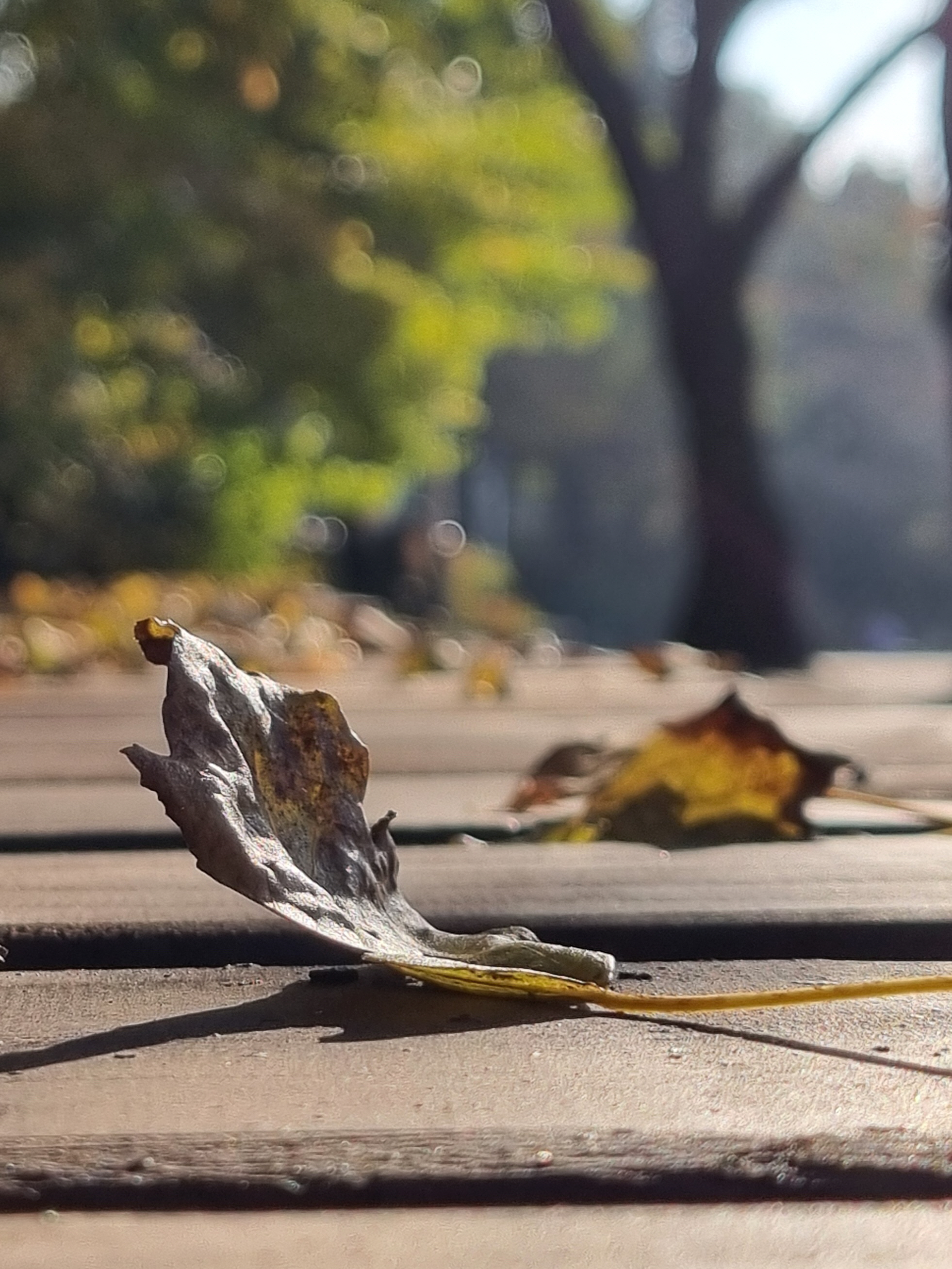 그러나 공원 초입, 굳건히 서 있는 거대한 느티나무들이 나를 맞이하는 방식은 사뭇 달랐다. 앙상한 가지에는 이미 대부분의 잎들이 제자리에서 벗어나, 바람에 뒹굴고 있었다. 단풍의 절정을 논하기엔 이미 시기를 놓쳐버린 것이다.